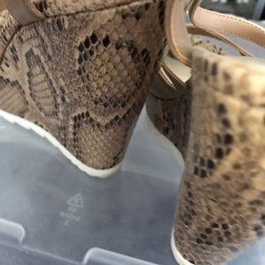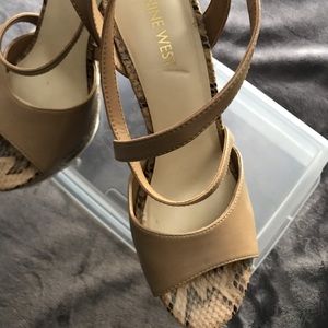 Nine West wedge sandal. Tan and snake skin, 5” wedge and 1 1/2” platform.