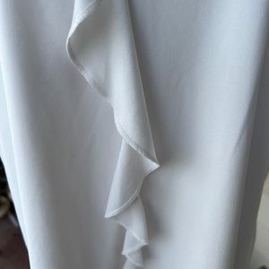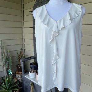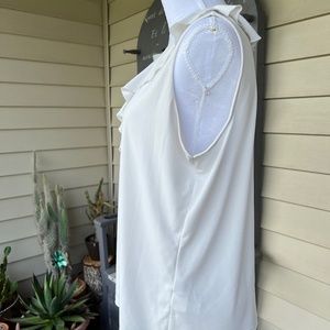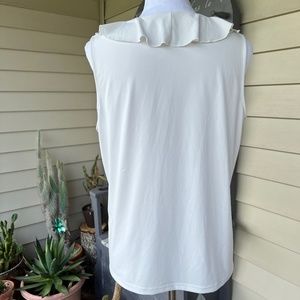 Pretty ruffled slip over, sleeveless blouse. Size L. Ruffle all the way around the neck. Color is more Ecru than White Very light weight and comfy