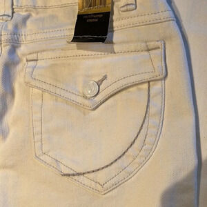 Nine West Bleeker Fit bootcut white jeans. Cotton/spandex blend. 5-pocket style. Back button flap pockets with gray topstitching. Button waistband. NWT. Size 2/waist 25. Nonsmoking home.