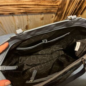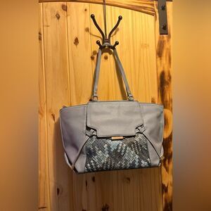 Nine West Beautiful and versatile double strap handbag is faux leather, inside pockets, outside pocket compartments on both sides of the purse. Magnetic clasp, and zipper closure. Heavy duty hardware, four studs at the bottom