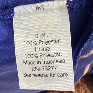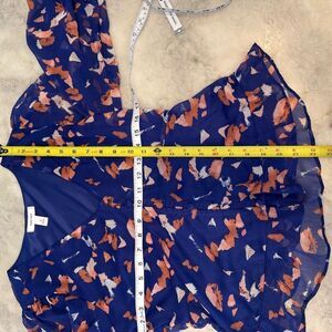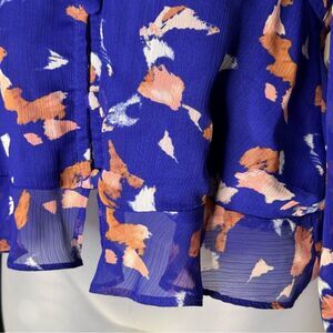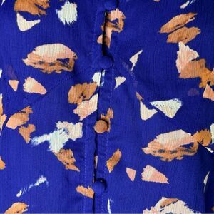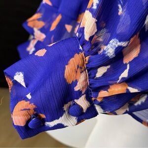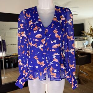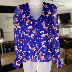 In excellent condition. Featuring a blue abstract print with orange and white accents. It has a V-neck, long sleeves, and a button-down front. The blouse has a peplum style with a ruffled hem.