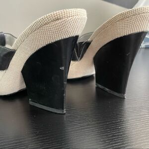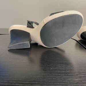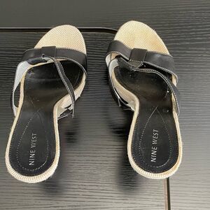 Nine West WNCOBALT Vintage Linen and Leather Upper Slide On Heeled Sandal. Black leather upper with white stitching. Slide on narrow block heel. Vintage and Retro feel. See pictures for wear. Size 10. EUC