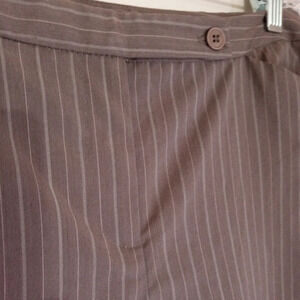 Nine and Co. by Nine West pinstripe trousers women's size 4. Taupe colored with pink and cream pinstripes. Front slant pockets and back slit pockets with button tab closure. Great pre-owned condition with no flaws noted.