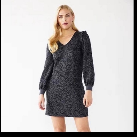 nine west NWT sweater dress, v neck, ruffle detail on shoulder, leopard print, warm fleece like lining, 34" from back to hem. cozy warm dress up or down
