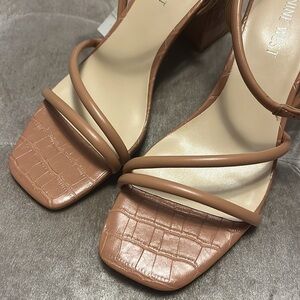 These are nine west brand shoes that feature a tan color with soft straps, and an embossed 2 1/2 inch heel and instep. These are super comfortable, best for a narrow to a medium width foot. I love these because they can be worn year-round with just about anything. Dress them up or dress them down, wear with jeans, skirts, dresses, and look great while still being comfortable. Adjustable buckle at the ankle. New with store tag attached.