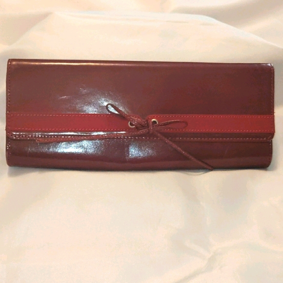 Red polyester & leather. Silver chain can be taken out and used as a purse. Never used.