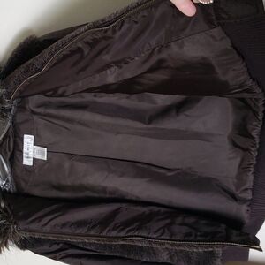 Nine west faux fur cropped fall winter coat with hood, brown, zipper closure, Like new condition, women's size medium