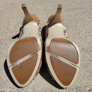 nine west leopard pattern pumps. man made materials. There is cracking on leopard print (man made material). Shoes are still wearable.