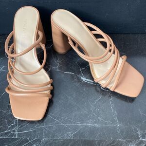 Brand new, never worn slip on styling faux leather multi strap sandals with approx 3.25" block heel and square toe 9.5