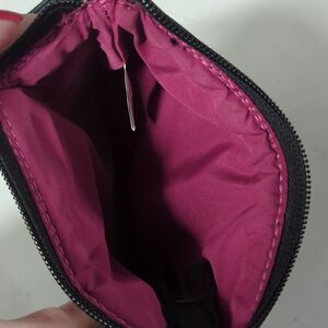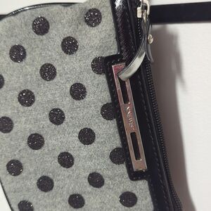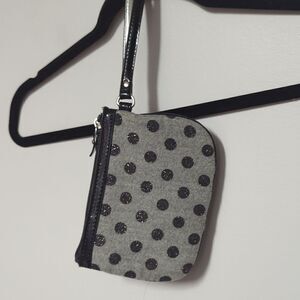 Cute, black and gray polka dot. The dots have a fun sparkle design. Zipper pocket, pink lining.