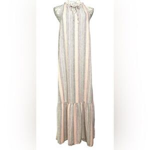 Linen blend striped sleeveless halter maxi dress with ruffle tier hem.