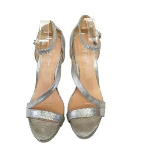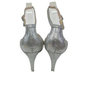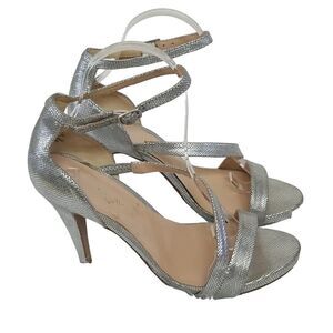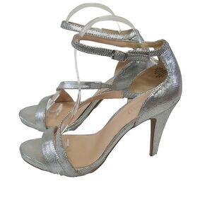 Preowned Nine West Silver 4inch Strappy Heel Sandals size 8.5 in excellent used condition.