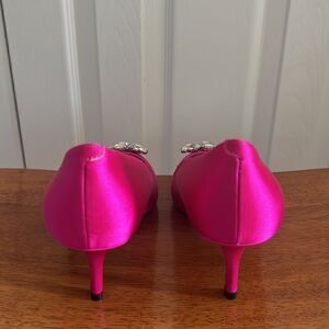 A jewel-encrusted ornament adds timeless glamour to the vamp of a luxe satin pump framed by a pointy toe and tapered heel. 2 1/4" heel Textile upper/