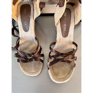Features long brown ribbed ribbon straps to tie above the ankle.