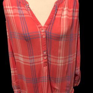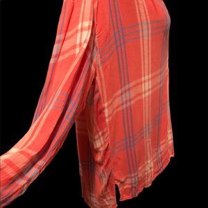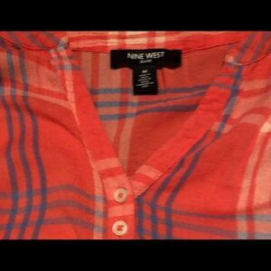 Nine West Jeans popover plaid blouse;100 percent viscose. Button tab sleeves. Salmon color with blue and white plaid. Hi low oversized light flowy material. EUC