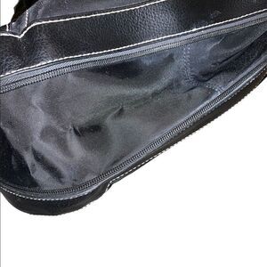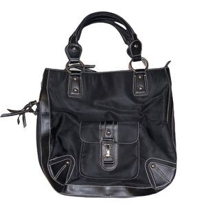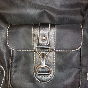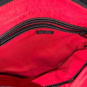 Black nylon tote bag. Two handles. Front pocket with buckle closure. Inner pockets. Zipper on sides and bottom to make more space in bag. Fully lined (red lining). 13”H x 13.5”L x 5.25”W. Preowned in good condition.