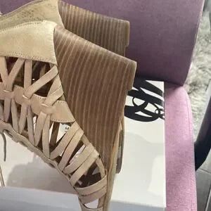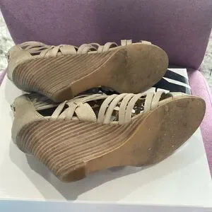Used Nine West nude wedges sandals. They are in good condition but have some marks on the back of one sandal. It doesn’t affect the use of the sandal. Please see all pictures. Comes with box. All sales are final