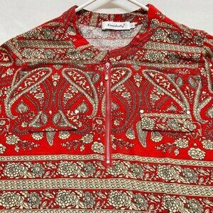 Ninedaily 3/4 Sleeve Blouse Women's Large Red Tan Paisley 1/2 Zip Casual Tunic
