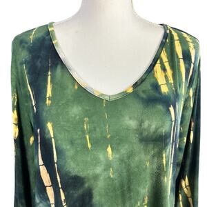 Details: Green Tie Dye Tunic With Yellow Bamboo Inspired Design Asymetric and Stretchy with 3/4 Sleeves Top