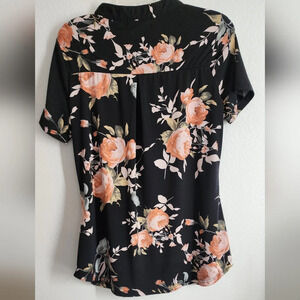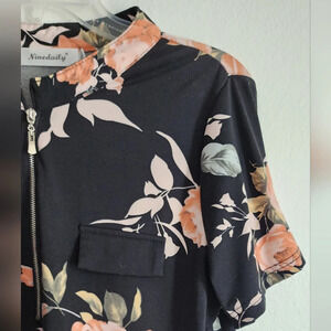 Ninedaily Women's 1/4 zip Pullover Floral Short Sleeve Blouse Sz L