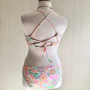 Ruched Bottom, Strappy Back, Bra Strap Detail, 60s Psychedelic Floral Pattern