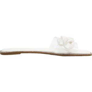 A transparent strap with matte chain accent elevate this sleek slide sandal framed by a squared-off toe.