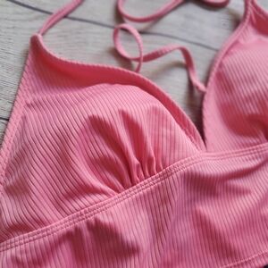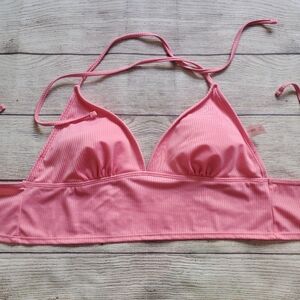 Soft pink ribbed triangle swim top. Adjustable halter and back ties. Stretch band for a snug fit. Clean, feminine swim silhouette.
