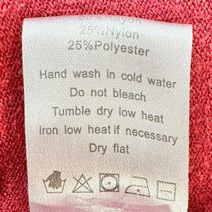 • Hand wash in cold water. Do not bleach. Tumble dry low heat. Iron low heat if necessary. Dry flat.