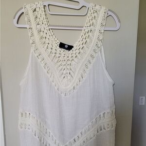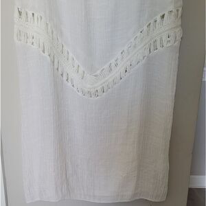 White, sleeveless mini dress by Nino Balcutti. The dress features a crochet-style design around the neckline and a band of the same design around the mid-section. This design element adds texture and visual interest to the otherwise simple, lightweight fabric of the dress. Nino Balcutti is a brand known for its women's clothing, including dresses, jumpsuits, and tops, often featuring bohemian-inspired designs.