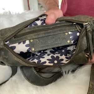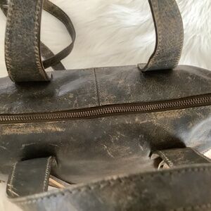 Dark green/black vintage aviator leather with whip stitch detail. Multiple pockets. Like new. The overall stressed leather appearance is part of the design. Dimensions 13”L x 4” W x 9” H.