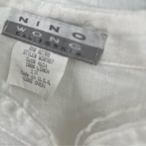 Nino Wong California Womens Size 1X Vintage Linen Button Up Top White Floral embellished pocket. Long sleeves with button cuffs. Lace edged high collar. Bust 50. Length 31. Measurements are approximate. Very good preowned condition.