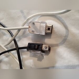 Pair of Nintendo controllers for a Wii. One black, one white. Wired connection.