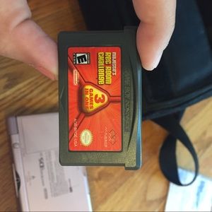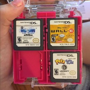 Comes with: a Nintendo DS in like new condition, a bag with slots for games, chargers and more, a charger and SEVEN games! This also includes a storage container for the games. The game without a picture on it is called Paws and Claws Pet Vet.