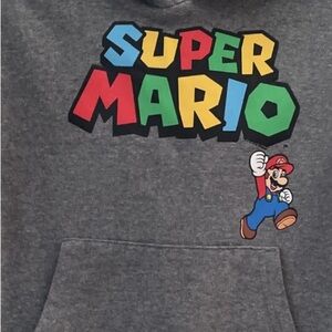This gray Nintendo hoodie features a vibrant Super Mario logo and character design, perfect for gaming enthusiasts. Made from soft sweatshirt material, it offers a comfortable fit with a classic pullover style and hood. The colorful logo adds a nostalgic touch to this casual piece.