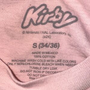 Pink short sleeve tee featuring Kirby and food graphics. Bold yellow text design.