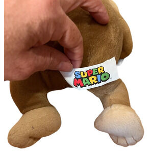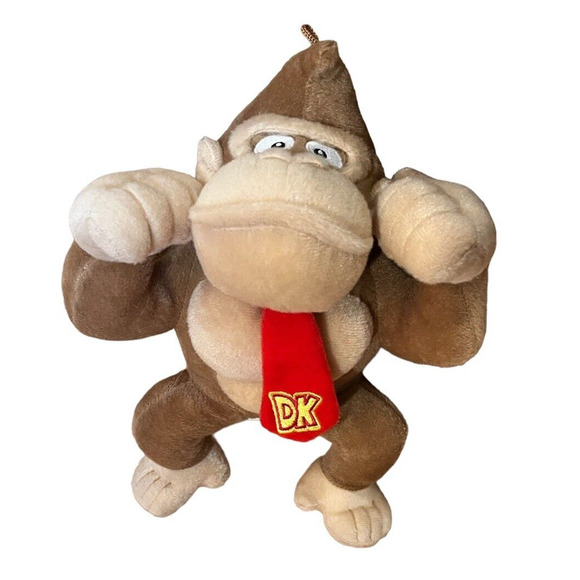 This is a plush Donkey Kong ape. He's about 11" tall and 9" wide with a cute red tie on that says DK! He is made by Super Mario and Basic Fun. Very good used condition with no signs of wear. This is a fun stuffed animal for the video game enthusiast!