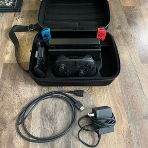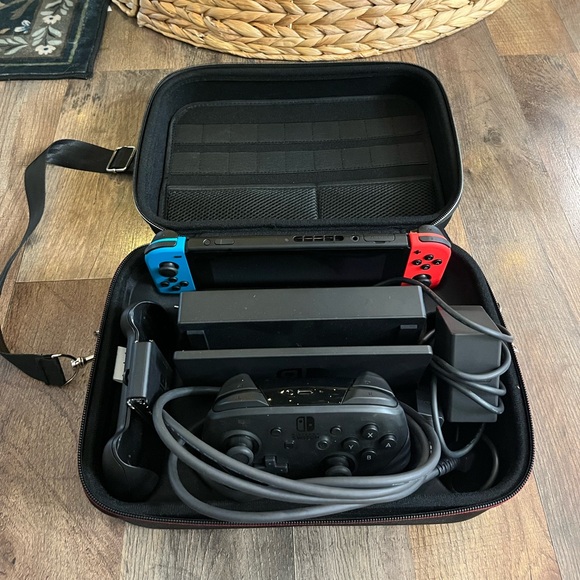 Nintendo Switch console with blue and red Joy-Con. Includes carrying case and additional controller.