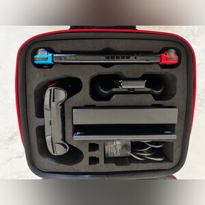 Hard shell travel case, console dock, HDMI cable, pro-controller, Joycon connector, charger.