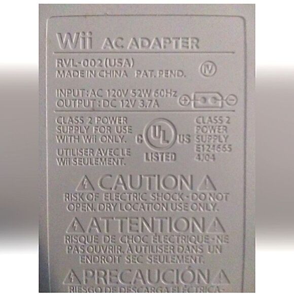 Nintendo Wii Power Cord Power Supply OEM Genuine (RVL-002)- Tested- Excellent..