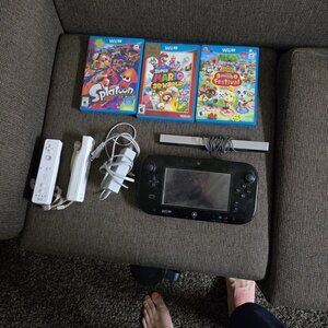 A used wii u includes 3 physical games, 25 digital games, sensor bar, 2 remotes, gamepad with charger.