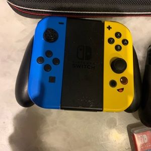 Nintendo switch with fortnite themed joycons, handheld controller, games ( Mario and rabbit and RBI baseball), carrying case, and joycon clip in controller.