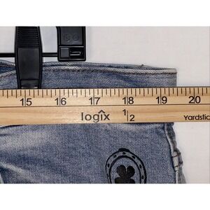 * Description: The Ninth Hall Rogue Men's Skinny Jeans in light wash size 38x34 offer a stylish and edgy look with their gothic and grunge-inspired graphic print. These ultra low-rise jeans feature a distressed denim fabric with a geometric pattern, showcasing a slim fit and 5-pocket design.