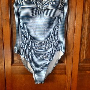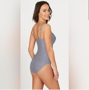 Nip Tuck Swim Sorrento Stripe Joanne One Piece Swimsuit Blue Mini Stripes Size 8. Description included in pictures. Tummy Control. Cup size includes C, D, and DD. In excellent condition! 85% nylon 15% spandex body, 100% nylon lining. Size 8.