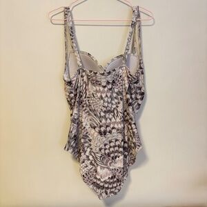 Nip Tuck Swim US Feathered Fantasy Joanne Twist Front Tummy Control One Piece Swimsuit in Grey Pink and Cream Pattern and Womens US Size 12. Gently used and in clean excellent condition.