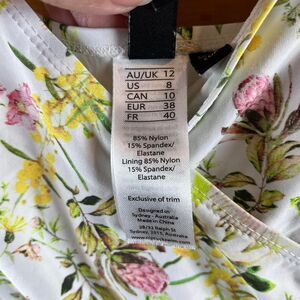 Nip Tuck Women's White Floral One Piece Ruched Swimsuit. It features a crossover front, a V-neckline, adjustable straps, and a ruched side with an adjustable tie. The swimsuit is designed with a multifit bra cup to accommodate various bust sizes and includes powermesh lining for tummy control and support.