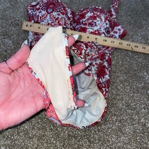 one-piece swimsuit with a bold red and white floral paisley print. The suit has a sweetheart neckline with molded, underwire-style cups that offer structured support. The wide, adjustable straps provide both comfort and stability.