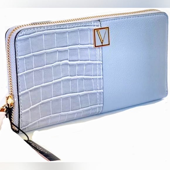 Nwt luxury Victoria's Secret sky blue 1/2 patent vegan croc 1/2 smooth eco leather gold tone v monogram.