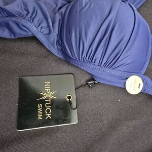 Elegant navy blue one-piece swimsuit with ruched detailing. Perfect for a stylish beach day.