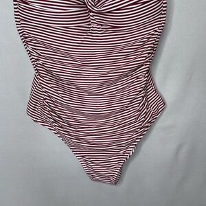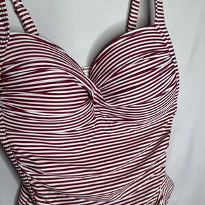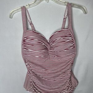 NipTuck Striped Cross-Front One-Piece Swimsuit In Burgundy/White. Size 10. Stylish one-piece swimsuit with red and white stripes. Features a flattering design with adjustable straps. Excellent condition.