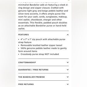 The Expanded Pouch is a spacious yet minimalist Bandolier add-on featuring a sleek d-ring design and zipper closure. Crafted with genuine light grey and beige pebble leather and silver-tone accents, it offers ample purse-like room for your cash, cards, sunglasses, makeup, mini wallet, checkbook, charger and other essentials. This flexible, padded pouch doubles as an attachable Bandolier purse or hand-held wallet.